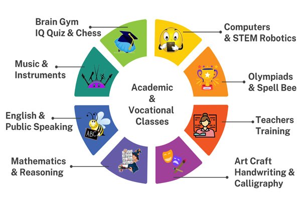 Our center offers a wide range of academic and vocational programs, including Art & Craft, Mathematics, Phonics, Grammar, Creative Writing, Public Speaking, Brain Gym, IQ Quizzes, Current Affair, Rubik’s Cube, Sudoku, Chess, STEM Engineering, Lego Robotics, Advanced Robotics, Computing, Coding – Scratch, HTML, Python & Java, Artificial Intelligence, Graphics Designing, Music & Instruments & Olympiads. Each program is carefully designed to follow four step structure of grow, hone, achieve, and showcase.
